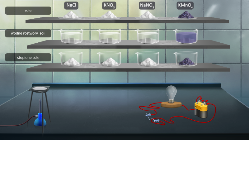 Przy pomocy symulacji zbadaj przewodnictwo elektryczne soli w postaci stałej, stopionej oraz w roztworach wodnych. Wybierz z listy odpowiednią sól i sprawdź, kiedy żarówka się świeci.