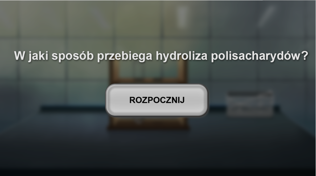 W symulacji interaktywnej zbadano skrobię oraz celulozę. Zarówno skrobia , jak i celuloza nie rozpuszczają się w wodzie, tworzą z nią zawiesinę o białym zabarwieniu. W trzech probówkach umieszczono zawiesinę skrobi w wodzie. Do pierwszej dodano roztwór chlorowodoru, do drugiej, celulazę, zaś do trzeciej, ptialinę. Pierwsza probówka (): skrobia strzałka w prawo, za strzałką dekstryny , strzałka w prawo, za strzałką maltoza <math aria‑label="en drugich">n2 , strzałka w prawo, za strzałką glukoza n . Następnie dla produktu reakcji z kwasem chlorowodorowym przeprowadzono próbę Tollensa z wykorzystaniem odczynnika Tollensa. Dodano go do roztworu za pomocą pipety. Po czym zawartość probówki ogrzano w płomieniu palnika. Próba kontrolna, czyli zawiesina skrobi w wodzie, dała negatywny wynik. Brak reakcji. Zaś próba badawcza po hydrolizie z udziałem kwasu dała pozytywny wynik. Na dnie probówki powstało lustro srebrowe. Co prezentuje następujące równanie. Cząsteczka glukozy o następującym wzorze Fischera: grupa połączona z pionową linią skierowaną do dołu, która symbolizuje łańcuch węglowy i na końcu łączy się z grupą . Wspomnianą linię przecinają cztery krótkie poziome, prostopadłe do niej linie. Po prawej stronie linii od góry kolejno znajdują się podstawniki , , oraz . Po lewej stronie od góry podstawniki , , oraz . Dodać dwa jony , dodać trzy jony . Strzałka w prawo, nad strzałką zapis "ogrzewanie", za strzałką produkty. Jon glukonianowy o następującym wzorze Fischera: grupa połączona z pionową linią skierowaną do dołu, która symbolizuje łańcuch węglowy i na końcu łączy się z grupą . Wspomnianą linię przecinają cztery krótkie poziome, prostopadłe linie. Po prawej stronie linii od góry kolejno podstawniki, , , oraz . Po lewej stronie od góry podstawniki , , oraz . Dodać dwa atomy srebra strzałka w dół, dodać cztery cząsteczki amoniaku , dodać dwie cząsteczki wody . Druga probówka (celulaza): brak reakcji. Trzecia probówka (ptialina): skrobia dodać n strzałka w prawo, na strzałką ptalina, za strzałką dekstryny . Dodać maltozę b razy . Gdzie n większe niż a oraz n większe od b . Dalej zbadano reaktywność celulozy. W trzech probówkach umieszczono celulozę z wodą. Do pierwszej probówki dodano roztwór chlorowodoru, do drugiej celulazę i celobiazę, zaś do trzeciej ptialinę. Pierwsza probówka (): celuloza dodać n strzałka w prawo, za strzałką celobioza <math aria‑label="en drugich">n2 , strzałka w prawo, za strzałką glukoza n . Przeprowadzono próbę Tollensa, która ponowenie dla produktu reakcji z celulozy z kwasem dała wynik pozytywny. To znaczy powstało lustro srebrowe. Schemat reakcji jest analogiczny, jak zostało już to dokładnie omówione. Z kolei próba kontrolna, czyli zawiesina celulozy w wodzie, dała negatywny wynik próby Tollensa. Druga probówka (celulaza i celobiaza): celuloza dodać n strzałka w prawo, za strzałką celobioza <math aria‑label="en drugich">n2 , strzałka w prawo, za strzałką glukoza n . Podobnie, jak w poprzednim przypadku, próba badawcza po hydrolizie enzymatycznej dała pozytywny wynik. Z kolei próba kontrolna negatywny. Trzecia probówka (ptialina): brak reakcji.