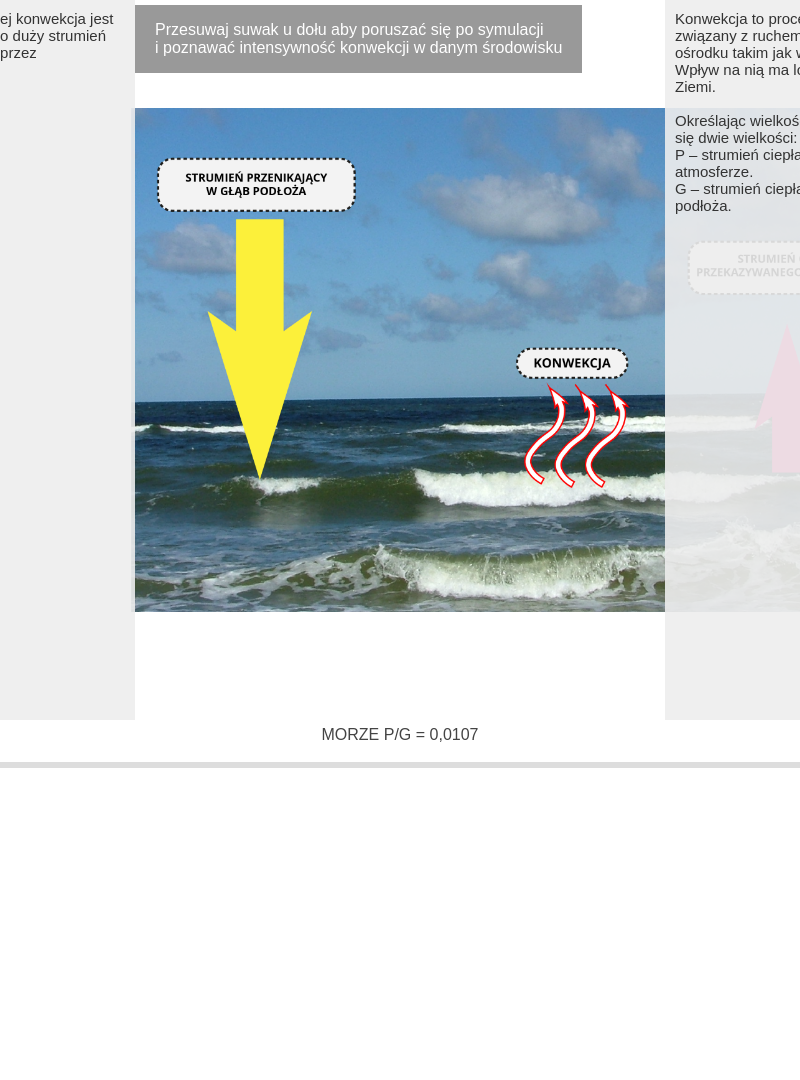 Symulacja interaktywna prezentuje różne wielkości konwekcji. Konwekcja to proces przekazywania ciepła związany z ruchem makroskopowym w ośrodku takim jak woda czy powietrze. Wpływ na nią ma lokalny bilans cieplny Ziemi. Określając wielkość konwekcji wykorzystuje się dwie wielkości: P – strumień ciepła przekazywanego atmosferze. G – strumień ciepła przenikającego w głąb podłoża. W przypadku wody morskiej konwekcja jest niewielka, ponieważ bardzo duży strumień ciepła zostaje pochłonięty przez powierzchnię wody. MORZE P/G = 0,0107. Woda stojąca, np. jezioro, oddaje prawie taki sam strumień ciepła w porównaniu do jego pochłaniania. WODA STOJĄCA P/G = 1,07. Do powierzchni granitowych przenika większy strumień ciepła niż ten, który zostaje oddany do atmosfery. GRANIT P/G = 0,61. Piasek oddaje najwięcej ciepła, ponieważ dwa razy więcej ciepła zostaje oddane niż pochłonięte. SUCHY PIASEK P/G = 2,57. Gleby gliniaste pochłaniają bardzo dużo strumieni cieplnych. GLEBA GLINIASTA P/G = 0,26. W przypadku śniegu zbitego przenika większy strumień ciepła niż ten, który zostaje oddany do atmosfery. ŚNIEG ZBITY P/G = 0,66.