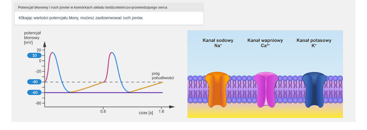Symulacja dotyczy potencjału błonowego i ruchu jonów w komórkach układu bodźcotwórczo‑przewodzącego serca. Na symulacji pokazano wykres zależności zmiany potencjału błonowego podanego w miliwoltach od czasu podanego w sekundach oraz zmiany zachodzące w błonie komórkowej. Na wykresie na osi Y są wartości od -90 do +20. Na osi X podano wartości 0,8 sekundy oraz 1,6 sekundy. Od wartości -40 na osi Y poprowadzono linię przerywaną równoległą do osi X. Opisano ją jako próg pobudliwości. Krzywa na wykresie rozpoczyna się przy wartości -40 miliwoltów na osi Y i wartości 0 na osi czasu. Następnie wznosi się do wartości wynoszącej +10 miliwoltów, po czym opada do wartości -60 miliwoltów. Ponownie wznosi się, ale tym razem łagodnie, wzdłuż osi X do linii przerywanej oznaczającej próg pobudliwości – po czym gwałtownie osiąga kolejne maksimum. Moment wznoszenia się następuje w czasie 0,8 sekundy. Po wzroście gwałtownie opada i znów łagodnie wznosi się wzdłuż osi X. Po czasie 1,6 sekundy krzywa gwałtownie biegnie w górę. Wznoszenie się krzywej to depolaryzacja, gwałtowny spadek to repolaryzacja, łagodne znoszenie się do progu pobudliwości to przedpotencjał. Obok wykresu na ilustracji jest błona komórkowa. Jej zewnętrzną część stanowią cząsteczki – mają hydrofilowe głowy na zewnątrz błony komórkowej i hydrofobowe ogony, skierowane do wnętrza błony. W błonie umieszczone są trzy kanały - kolejno od lewej strony do prawej: sodowy (), wapniowy () i potasowy (). Podczas przedpotencjału w błonie komórkowej otwiera się kanał sodowy i następuje powolny napływ jonów sodu do wnętrza komórki. Podczas depolaryzacji otwiera się kanał wapniowy – następuje nagły napływ jonów wapnia. Podczas repolaryzacji otwiera się kanał potasowy – następuje wypływ jonów potasu z komórki.