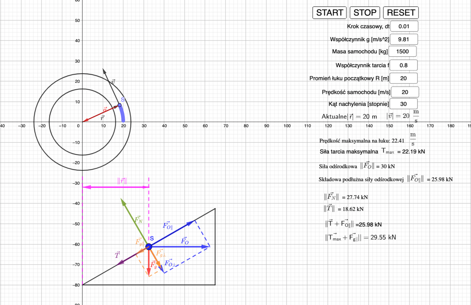 W symulacji możesz m.in. zmienić: kąt nachylenia jezdni, promień łuku oraz wartość prędkości , z jaką samochód „wchodzi” w zakręt. Możesz też zmienić współczynnik tarcia statycznego kół o nawierzchnię drogi. Współczynnik ten odnosi się do kierunku poprzecznego do kierunku ruchu, w którym to kierunku samochód się nie porusza. W zamieszczonej symulacji tarcie kinetyczne całkowicie zaniedbujemy.