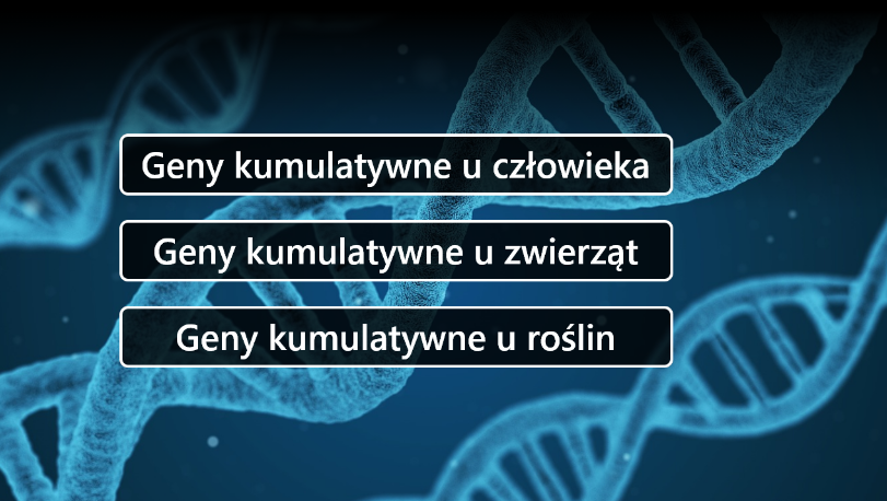 Symulacja. Na ekranie startowym pojawia się hasło poligenia, w tle znajdują się trzy podwójne helisy. Następnie pojawiają się trzy zdania: 1. Geny kumulatywne u człowieka. 2. Geny kumulatywne u zwierząt. 3. Geny kumulatywne u roślin. Po wybraniu punktu pierwszego, geny kumulatywne u człowieka, pojawia się zdanie Działanie genów kumulatywnych warunkujących barwę skóry człowieka i po prawej stronie na dole mamy przycisk dalej, aby przejść do kolejnego kroku, a po lewej stronie strzałkę, która pozwala nam się cofnąć do poprzedniego kroku. Pojawia się krzyżówka, gdzie uczeń musi sam napisać dane genotypy. Przykładowy ciąg genotypów wskazujący kolor skóry od najciemniejszej brązowej do średnio brązowej: męskie duże ABC w połączeniu z żeńskie duże ABC daje genotyp duże AABBCC; męskie duże A, duże B, małe c w połączeniu z żeńskie duże ABC daje genom dwa duże A, dwa duże B, duże C małe c; męskie duże A małe b duże C w połączeniu z żeńskie duże ABC daje genotyp dwa duże A, duże B, małe b, dwa duże C; męskie małe a duże B duże C w połączeniu z żeńskie duże ABC daje genotyp duże A małe a dwa duże B, dwa duże C; męskie małe a, małe b duże C w połączeniu z żeńskie duże ABC daje genotyp duże A, małe a, duże B, małe b, dwa duże C; męskie małe a, duże B, małe c w połączeniu z żeńskie duże ABC daje genotyp duże A, małe a, dwa duże B, duże C, małe c; męskie duże A, małe b małe c w połączeniu z żeńskie duże ABC daje genotyp dwa duże A, duże B, małe b, duże C, małe c; męskie małe abc w połączeniu z żeńskie duże ABC daje genotyp duże A, małe a, duże B, małe b, duże C małe c.