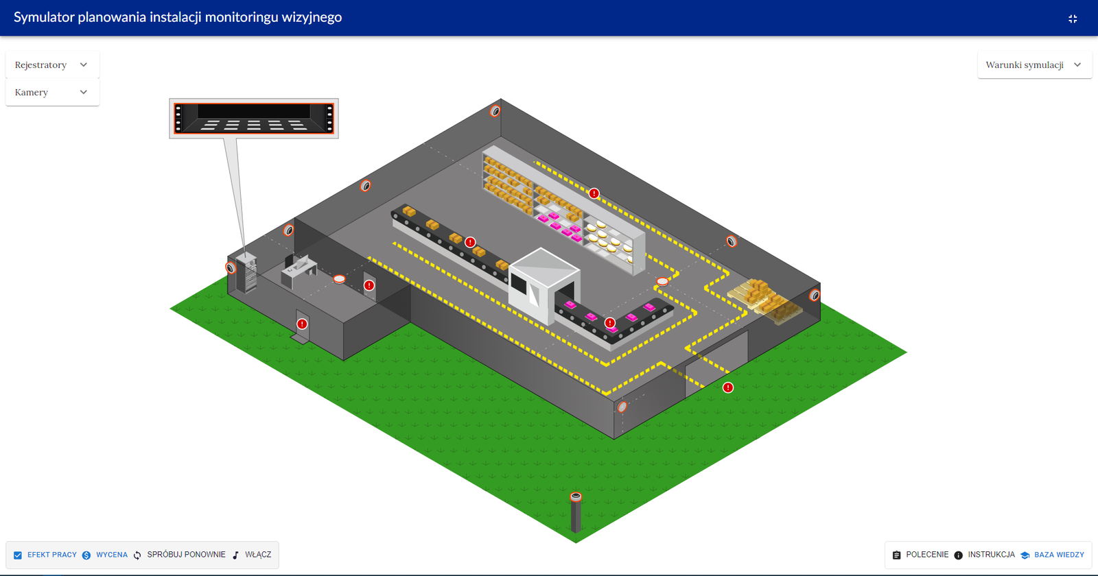 Widok symulatora. Zdjęcie przedestawia wnętrze hali produkcyjnej, a w niej taśmę produkcyjną wraz z regałami na produkty spożywcze. Obok znajduje się pomieszczenie z biurkiem przeznaczonym dla pracownika. Cały obiekt otacza pas zieleni. Po lewej stronie znajdują się zakładki z wyszczególnionymi rejestratorami i kamerami. Po prawej stronie można zobaczyć warunki symulacji, takie jak: deszcz, noc, mróz, światło Dyżurka. W dolnej części ekranu mieści się pasek z zakładkami: polecenie, instrukcja obraz baza wiedzy.