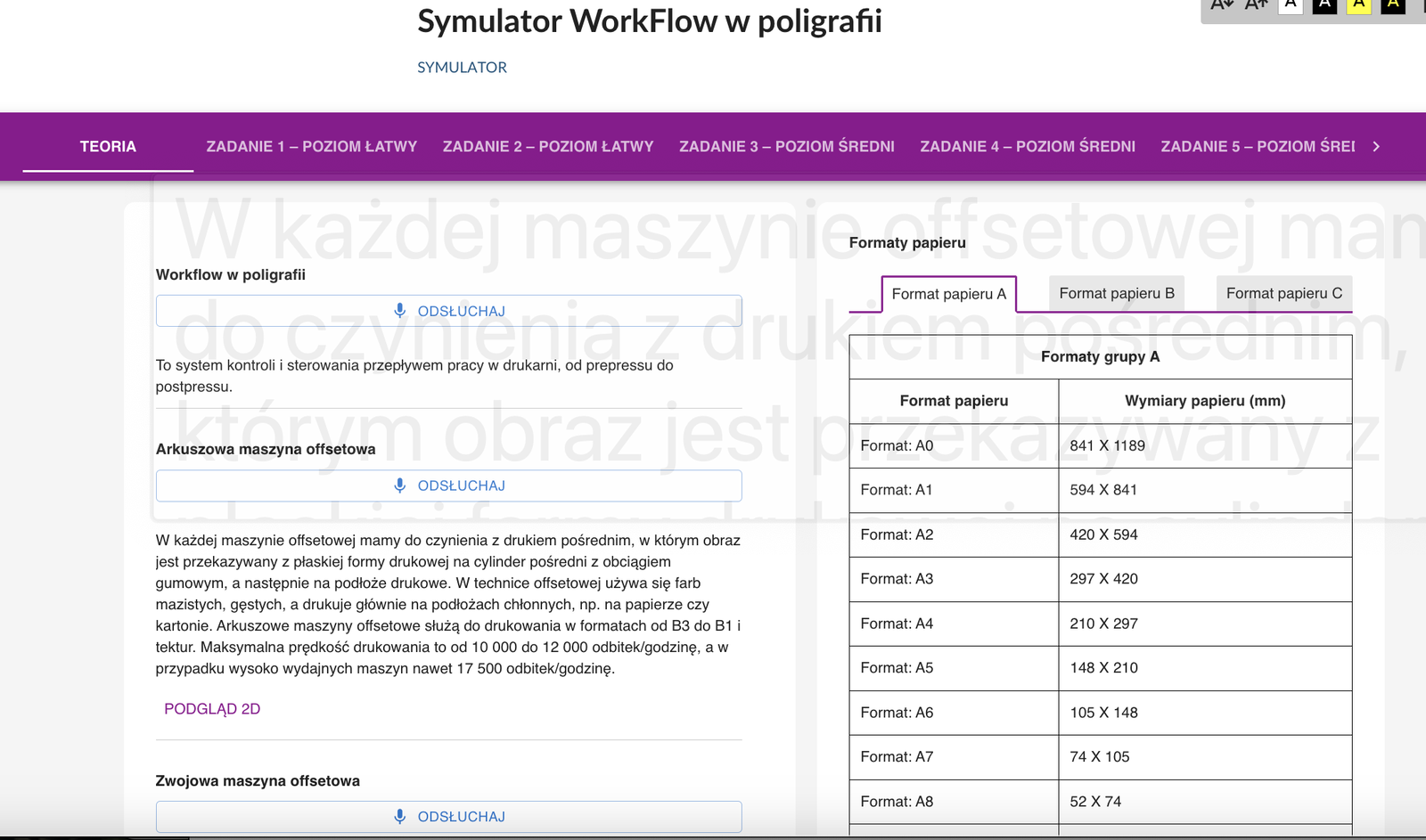 W górnej części ekranu, na fioletowej belce, znajdują się przyciski z siedmioma zadaniami do wykonania, o różnym poziomie trudności. Użytkownik, w dowolnej kolejności, może wybrać jedno z zadań. Zadanie te to: Zadanie 1. Dobór maszyn poligraficznych do druku teczki na dokumenty; Zadanie 2. Dobór maszyn poligraficznych do druku plakatu; Zadanie 3. Dobór parametrów druku plakatu; Zadanie 4. Dobór parametrów druku teczki na dokumenty; Zadanie 5. Dobór formatów do druku cyfrowego; Zadanie 6. Etapy procesu technologicznego wykonania broszury; Zadanie 7. Obliczenie kosztów druku plakatu. Po kliknięciu na wybrane zadanie, na głównym ekranie pojawia się polecenie z możliwością odsłuchania.