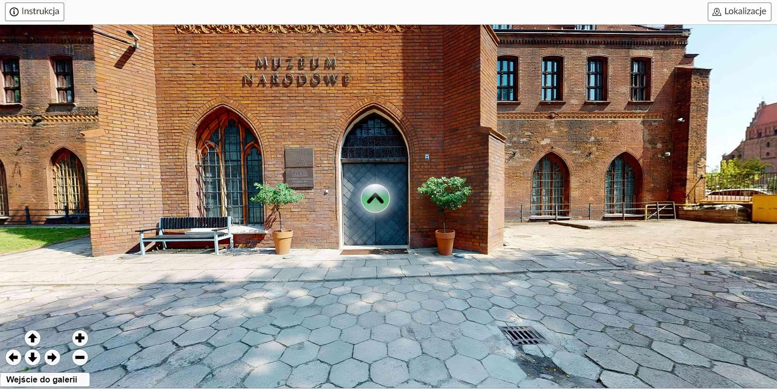 Spacer rozpoczyna się od wejścia do galerii. Widoczna część ulicy i chodnika oraz ściana z cegły dużego zabytkowego budynku. Na wprost dwuskrzydłowe metalowe drzwi wejściowe. Otwór drzwiowy zakończony łukiem. Po lewej stronie otwór okienny podobnych rozmiarów, zaczynający się niewiele ponad chodnikiem. W oknie krata. Po obu stronach drzwi roślina w doniczce. Przed oknem ławka. Między drzwiami i oknem dwie tablice. Wyżej napis zbudowany z metalowych liter: Muzeum Narodowe. Po prawej stronie budynku, w pewnej odległości, inny, mniejszy, zabytkowy budynek z jasną elewacją. Dalej inny budynek zasłonięty przez drzewa. Dalej duży trzypiętrowy budynek z płaskim dachem i elewacją w ceglanym kolorze. Przed budynkiem widoczna ulica, a przed ulicą płot z bramą wjazdową i bramką wejściową. Przesuwając się dalej w prawo ponownie widać kilka drzew i fragment trawnika. Po prawej znajduje się budynek Muzeum Narodowego. Na drzwiach wejściowych budynku znajduje się przycisk. Wciśnięcie go przenosi nas do korytarza. Podłoga jest ułożona z beżowych i czarnych kwadratowych kafli. Ściany i sufit są białe, sufit ze sklepieniem kryształowym. Korytarz jest dobrze oświetlony, z lewej strony znajdują się duże okna. Przy ścianach korytarza stoją dwa ozdobne stoły. Po obróceniu się w lewo widać drugi, bardzo podobny korytarz. W korytarzu naprzeciwko drzwi wejściowych jest przycisk z napisem: Przejdź do: Korytarz i sklep z pamiątkami. Po naciśnięciu go przenosimy się do szerokiego wejścia do dużej sali. Przy wejściu znajduje się przycisk z tekstem: Przejdź do: Sklep z pamiątkami. Po naciśnięciu go przenosimy się do dużej sali z białymi ścianami i sufitem. Sufit łukowy. Podłoga ułożona z beżowych kafli. W sali wiele czarnych, różnej wielkości regałów z książkami, miejscami do siedzenia zrobionymi z żółtych poduszek. Po wyjściu z sali z pamiątkami, wracamy do korytarza, w którym znajduje się przycisk: Przejdź do: Sala 1.