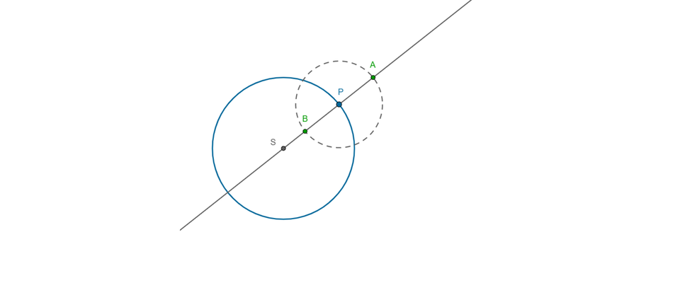 Na rysunku znajduje się okrąg o środku w punkcie S. Na okręgu znajduje się punkt P. Przez punkt S i P przechodzi prosta a. Punkt P jest środkiem okręgu o dowolnym promieniu, przecinającego okrąg o środku w punkcie S w dwóch punktach oraz prostą a w punkcie A i B.