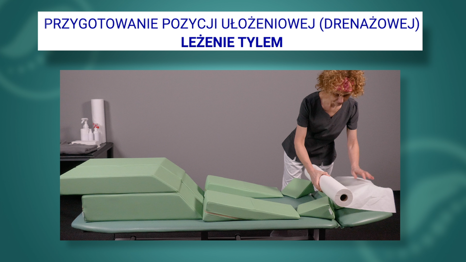 Film przedstawiający przygotowanie pozycji ułożeniowej (drenażowej) – leżenie tyłem.