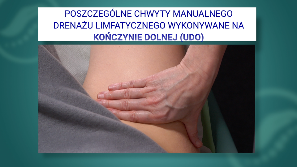 Film przedstawiający poszczególne chwyty manualnego drenażu limfatycznego wykonywane w obrębie kończyny dolnej (udo).