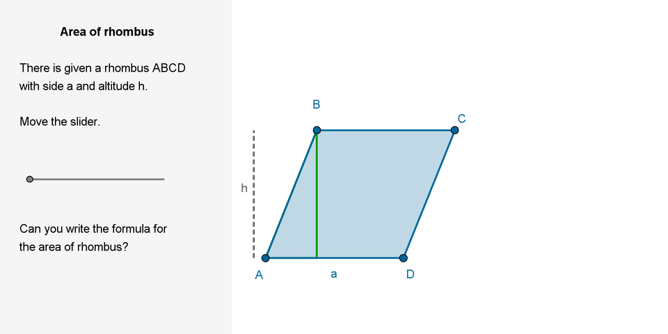 Open the applet and determine the formula for the area of rhombusarea of rhombusarea of rhombus.
