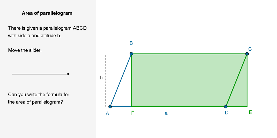 Open the applet and determine the formula for the area of a parallelogramarea of a parallelogramarea of a parallelogram.