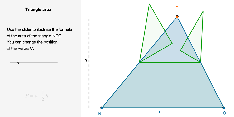 Geogebra aplet - symulacja pokazuje, że pole trójkąta jest równe polu prostokąta, którego jeden z boków jest równy połowie wysokości trójkąta, a drugi jest równy podstawie tego trójkąta. Galeria z opisami alternatywnymi poniżej.