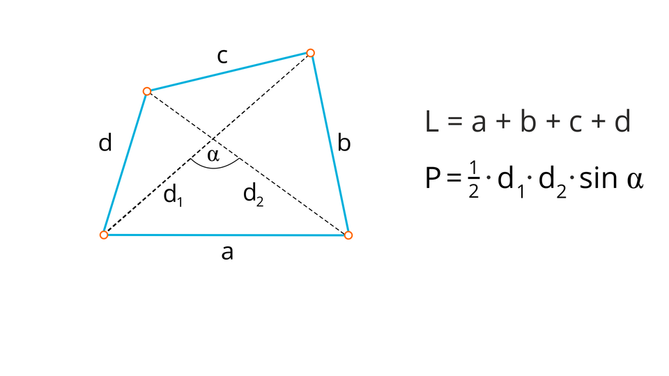 The conclusion. The areas of quadrangles can be calculated using the trigonometric function of the acute angles between the sides of the quadrangle( in case of a parallelogramparallelogram, a rhombus, a deltoiddeltoid) or between the diagonals (in case of a parallelogramparallelogram, any quadrangleany quadrangle).