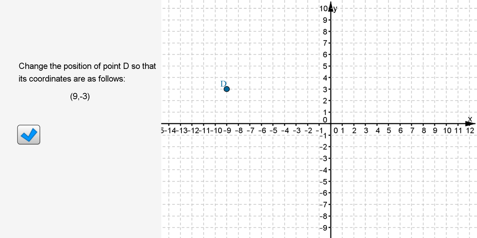 Geogebra aplet - w ćwiczeniu narysowany jest układ współrzędnych. Osie układu są podpisane liczbami od -10 do 10. Należy przesunąć punkt D tak, aby miał współrzędne podane w kolejnych etapach ćwiczenia. Galeria z opisami alternatywnymi poniżej.