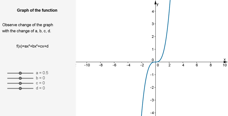 Po lewej stronie rysunku znajduje się układ współrzędnych. Oś pozioma oznaczona jest literą x. Na osi poziomej zaznaczone są liczby: minus dziesięć, minus osiem, minus sześć, minus cztery, minus dwa, zero , dwa, cztery, sześć, osiem, dziesięć. Oś pionowa oznaczona jest literą y. Na osi pionowej zaznaczone są liczby: minus siedem, minus sześć, minus pięć, minus cztery, minus trzy, minus dwa, minus jeden, zero, jeden, dwa, trzy, cztery. W układzie współrzędnych narysowany jest wykres funkcji. Krzywa, będąca wykresem funkcji znajduje się w pierwszej i trzeciej ćwiartce układu współrzędnych i przecina oś x w jednym punkcie. Jest to początek układu współrzędnych. Po prawej stronie rysunku znajduje się wzór ogólny funkcji, f, nawias zwykły, w nawiasie x, zamknąć nawias, równa się a pomnożone przez x do potęgi trzeciej dodać b pomnożone przez x do kwadratu dodać c pomnożone przez x dodać d. Poniżej zapis a równa się zero, kropka pięć, b równa się zero, c równa się zero, d równa się zero.