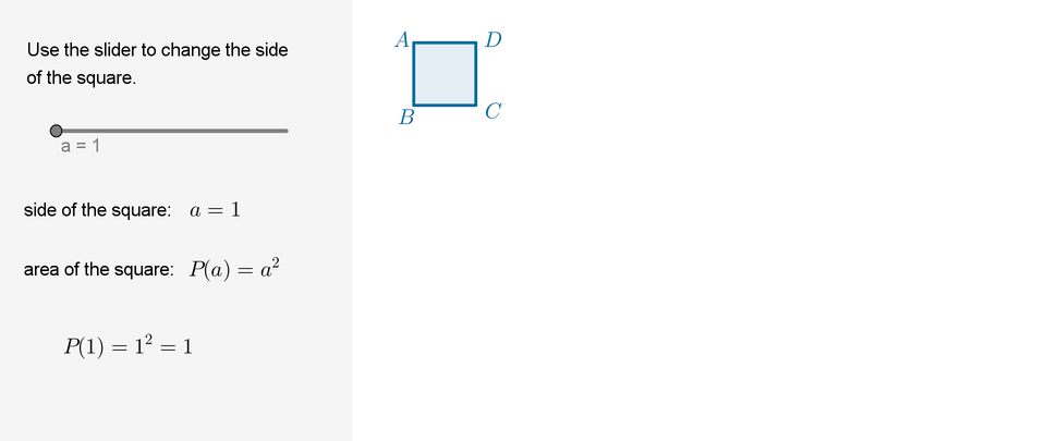 Geogebra aplet - Funkcja pola kwadratu. Galeria z opisami alternatywnymi poniżej.