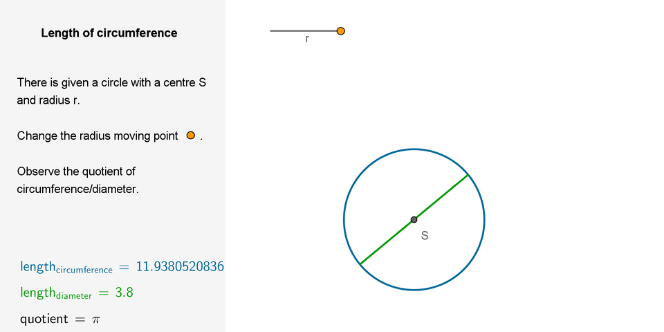 Geogebra aplet - Długość okręgu. Galeria z opisami alternatywnymi poniżej.