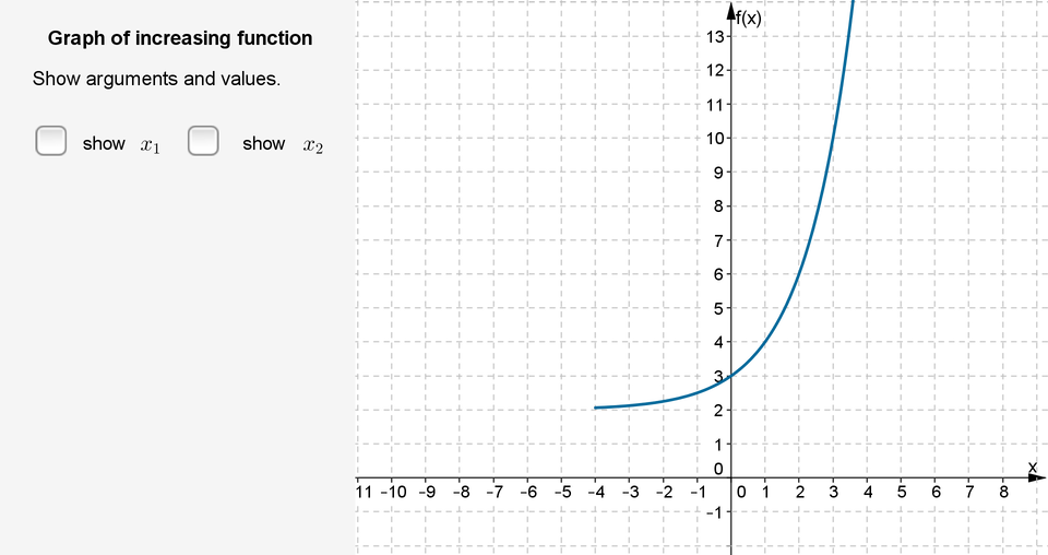 3. Check if for arguments 1 and 2 belonging in the domain of the function, the condition of the increasing functionincreasing functionincreasing function is met.