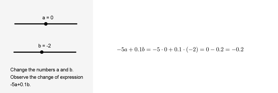 Geogebra aplet - symulacja pokazuje, ile wynosi wartość liczbowa wyrażenia −5a + 0,1b. Liczby a i b można zmieniać za pomocą suwaków. Galeria z opisami alternatywnymi poniżej.