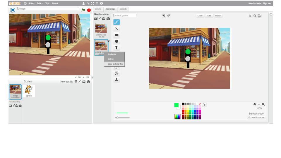 To create a traffic light standing at the pedestrian crossingpedestrian crossingpedestrian crossing, the Urban2 backdrop from the Backdrop Library was used. In the Scratch graphic editor, the traffic light was added. The changed backdrop was duplicated. On one copy a green colour was added to the traffic light, on the second - red. These backdrops will then be used in animation.