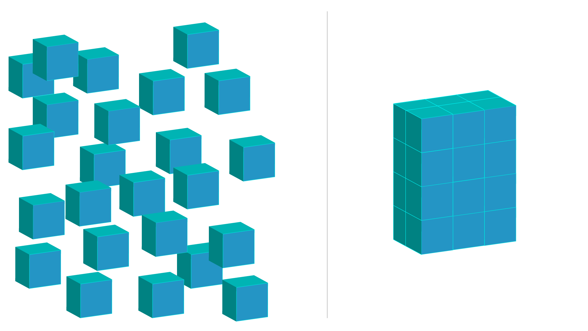 Ilustracja interaktywna przedstawia bryły. Po lewej stronie znajdują się dwadzieścia cztery jednakowe sześciany oznaczone numerem 1. Po prawej stronie narysowany jest prostopadłościan, oznaczony numerem 2, zbudowany z dwudziestu czterech jednakowych sześcianów. Jego podstawa składa się z sześciu sześcianów, ułożonych dwa na trzy. Na wysokość ułożone są cztery sześciany. Na numerach widoczne są podpisy. 1. blocks, 2. cuboid.