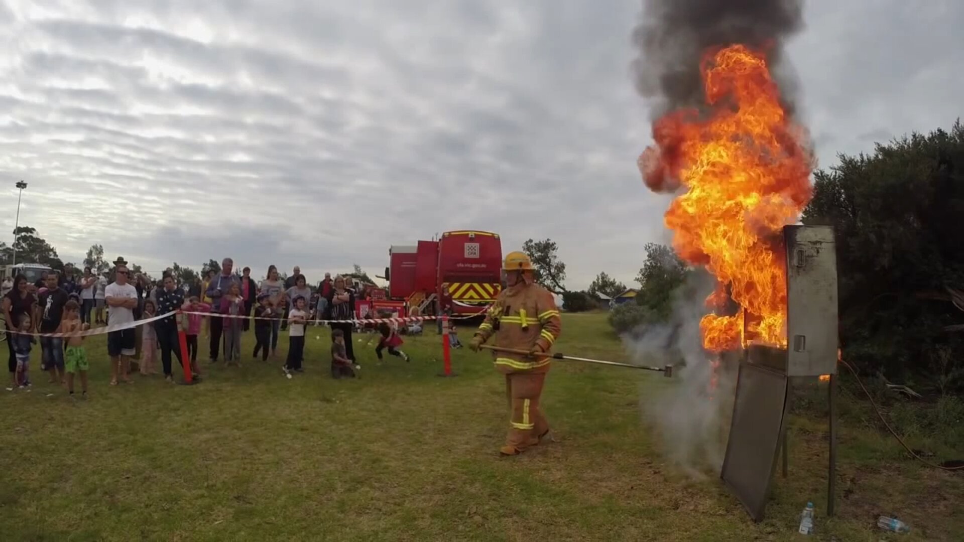 Film ukazuje, co dzieje się w przypadku gdy płonący olej jest gaszony wodą. Doświadczenie wykonane jest na świeżym powietrzu przez przeszkolonego strażaka