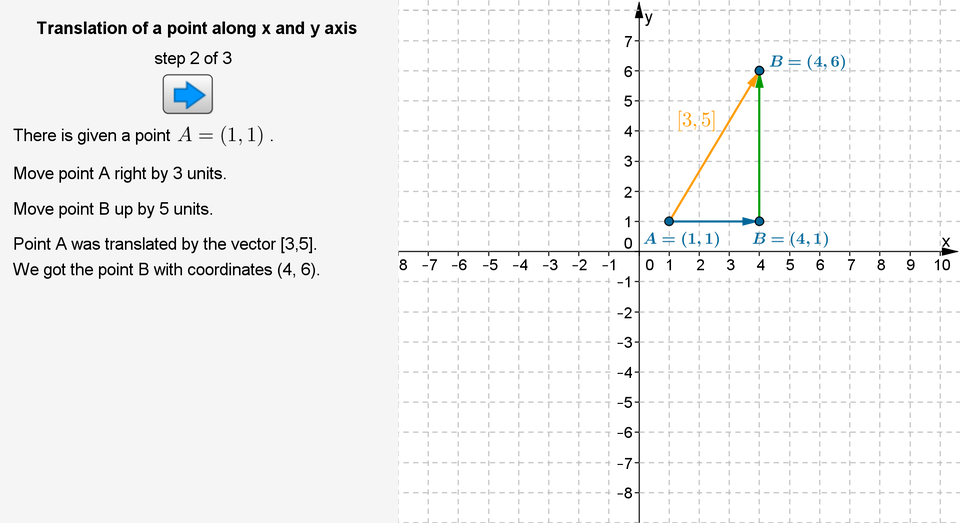 Geogebra aplet - Przesunięcie punktu w układzie współrzędnych. Galeria z opisami alternatywnymi poniżej.