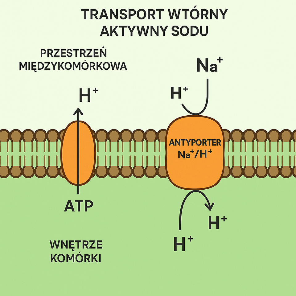 Komórki roślinne usuwają sód do środowiska na drodze transportu aktywnego wtórnego, w którym przenośnik antyporterowy jest sprzężony z pompą protonową wypompowującą jony HIndeks górny ++ do przestrzeni międzykomórkowej. Opisz mechanizm tego transportu.