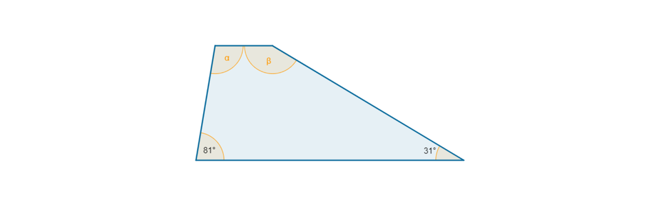 Na rysunku znajduje się trapez o kątach przy podstawie dolnej od lewej strony: osiemdziesiąt jeden stopni i trzydzieści jeden stopni oraz przy podstawie górnej od lewej strony: alfa i beta. Wyznacz kąty alfa i beta.