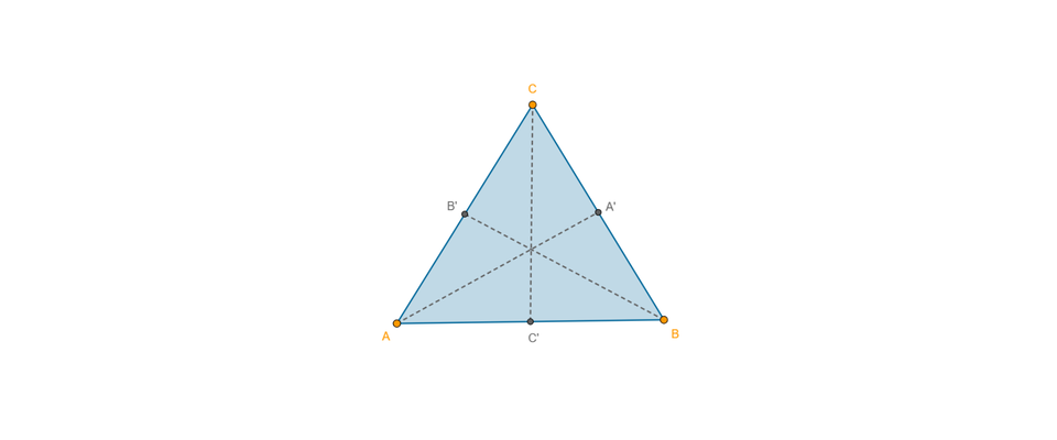Rysunek przedstawia trójkąt ABC z poprowadzonymi środkowymi od każdego z wierzchołków AA', BB', CC'.