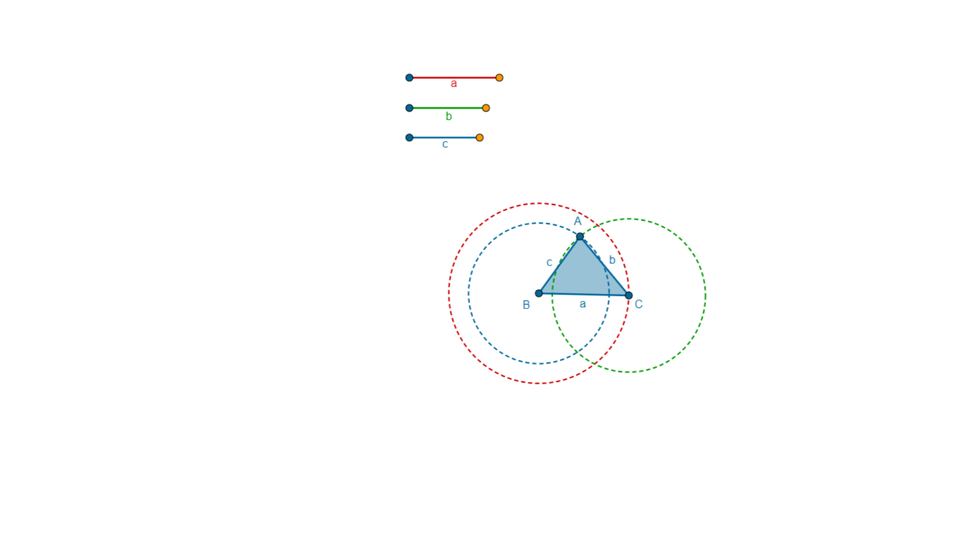 Rysunek przedstawia trójkąt A B C oraz odcinki a, b i c, które są długościami boków trójkąta. Z wierzchołka B narysowany jest okrąg o promieniu równym odcinkowi c. Z wierzchołka B narysowany jest okrąg o promieniu równym odcinkowi a. Z wierzchołka C narysowany jest okrąg o promieniu równym odcinkowi b. Długości odcinków pozwalają zbudować trójkąt.