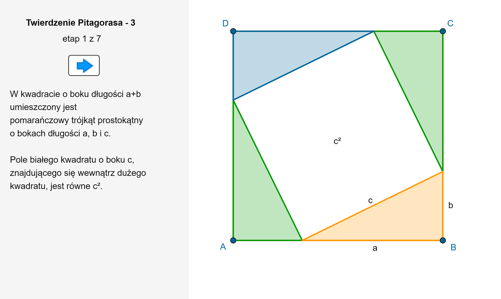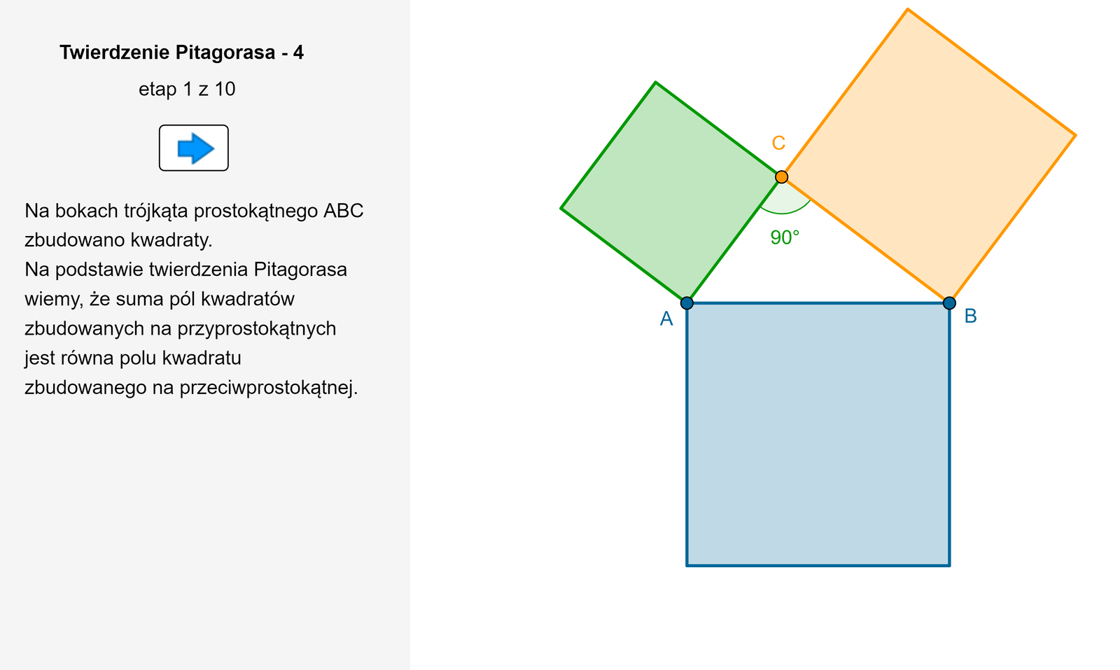 Zapoznaj się z poniższym apletem, w którym pokazany jest kolejny przykład dowodu twierdzenia Pitagorasa.