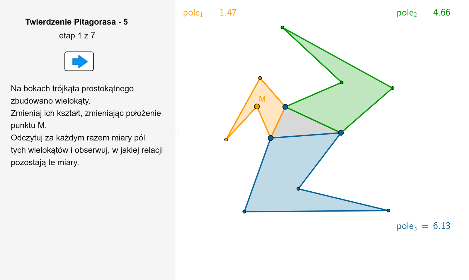 Zmieniaj odpowiednio kształt i wielkość wielokątów zbudowanych na bokach trójkąta prostokątnego. Sprawdź, czy dla pól tych wielokątów spełniony jest związek między polami wielokątów, wynikający z twierdzenia Pitagorasa.