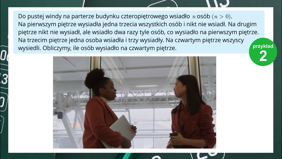 Na parterze do windy wsiadło osób. Na pierwszym piętrze wysiadła jedna trzecia wszystkich osób. W windzie zostało więc dwie trzecie osób, które wsiadły na parterze. Na drugim piętrze nikt nie wysiadł, ale wsiadło dwa razy tyle osób, co wysiadło na pierwszym piętrze, zatem dwie trzecie en. W windzie jest więc teraz cztery trzecie en osób. Na trzecim piętrze jedna osoba wsiadła i trzy wysiadły. W konsekwencji w windzie jest teraz o dwie osoby mniej. Do czwartego piętra dojechało cztery trzecie en minus dwie osoby i wszystkie te osoby wysiadły na tym piętrze.