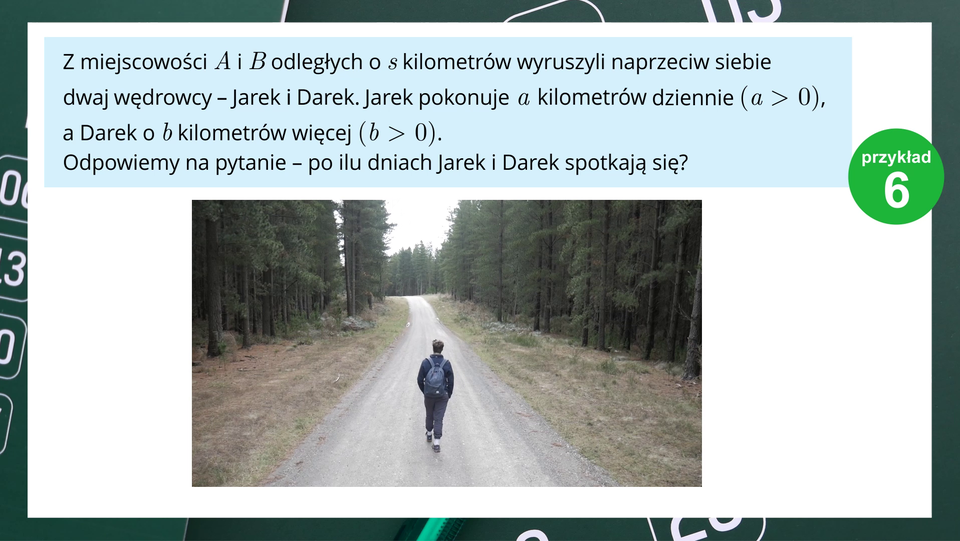 Z miejscowości A i B odległych od siebie o kilometrów wyruszyli naprzeciw siebie dwaj wędrowcy - Jarek i Darek. Jarek pokonuje kilometrów dziennie, a Darek o kilometrów więcej. Odpowiemy na pytanie – po ilu dniach Jarek i Darek spotkają się?
