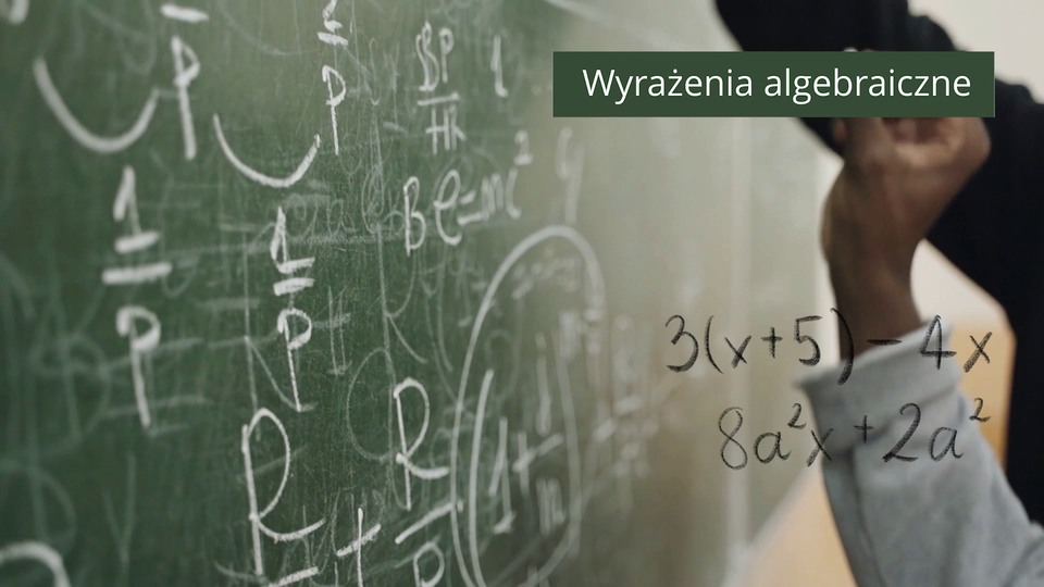 Nagranie ukazuje zbliżenie na rękę osoby piszącej po tablicy szkolnej. W tle widoczna ręka drugiej osoby, która także notuje na tablicy. W prawym górnym rogu znajduje się tekst: „Wyrażenia algebraiczne”. Tekst jest biały, na zielonym tle.