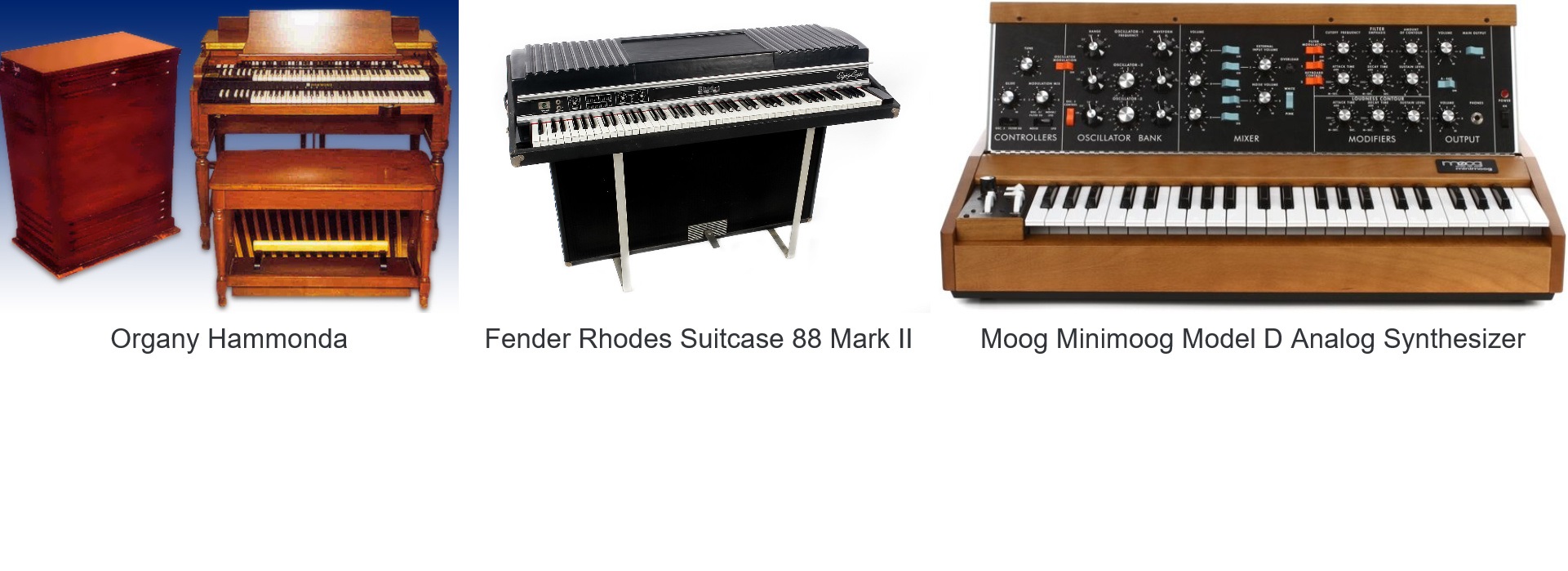 Klikaj w instrumenty i słuchaj brzmień kultowych instrumentów elektrycznych i elektronicznych.