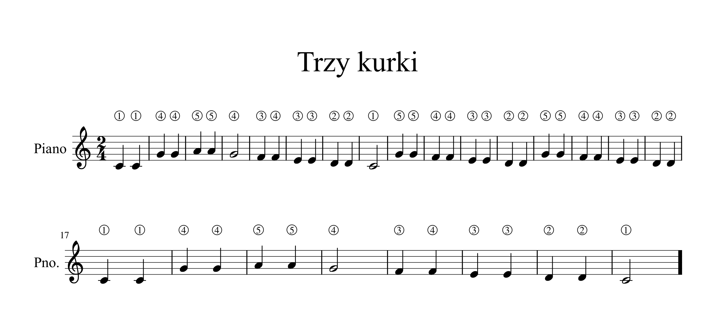 Wskaż wszystkie wartości rytmiczne, które występują w zapisie nutowym utworu Trzy kurki. Następnie zagraj melodię na keyboardzie zgodnie z oznaczeniami palców. W takcie 5 i 21 klawisz „f1” najpierw zagrasz palcem trzecim a potem czwartym.