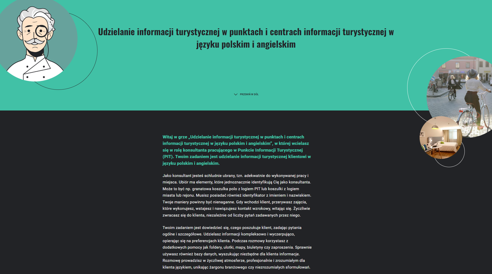 Gra wcielanie się w rolę: Udzielanie informacji turystycznej w punktach i centrach informacji turystycznej w języku polskim i angielskim, wymaga trybu pełnoekranowego. Aby przejść do tego trybu, należy kliknąć przycisk: „Włącz tryb pełnoekranowy”.