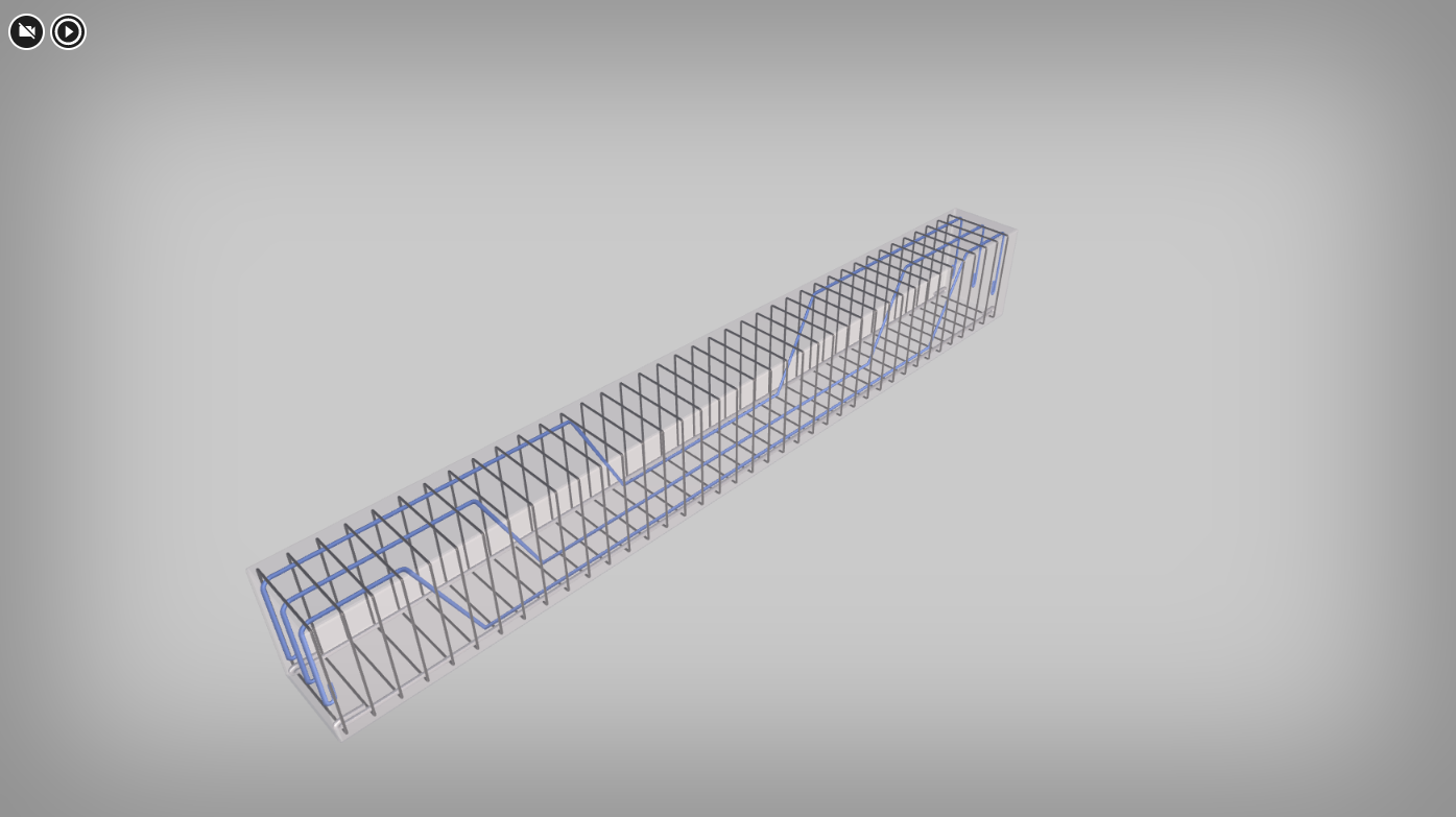 Wizualizacja trzy de przedstawia układ zbrojenia belki żelbetowej. Umożliwia obserwację obiektu z zewnątrz, z perspektywy obserwatora obchodzącego obiekt wokół, z góry i od dołu. Zaprezentowano na niej zbrojenie belki, które składa się z prętów głównych umieszczonych wzdłuż belki i połączonych za pomocą prętów pomocniczych, tworzących kwadratowe ramki. Zakończenia prętów głównych zostały zagięte do środka.