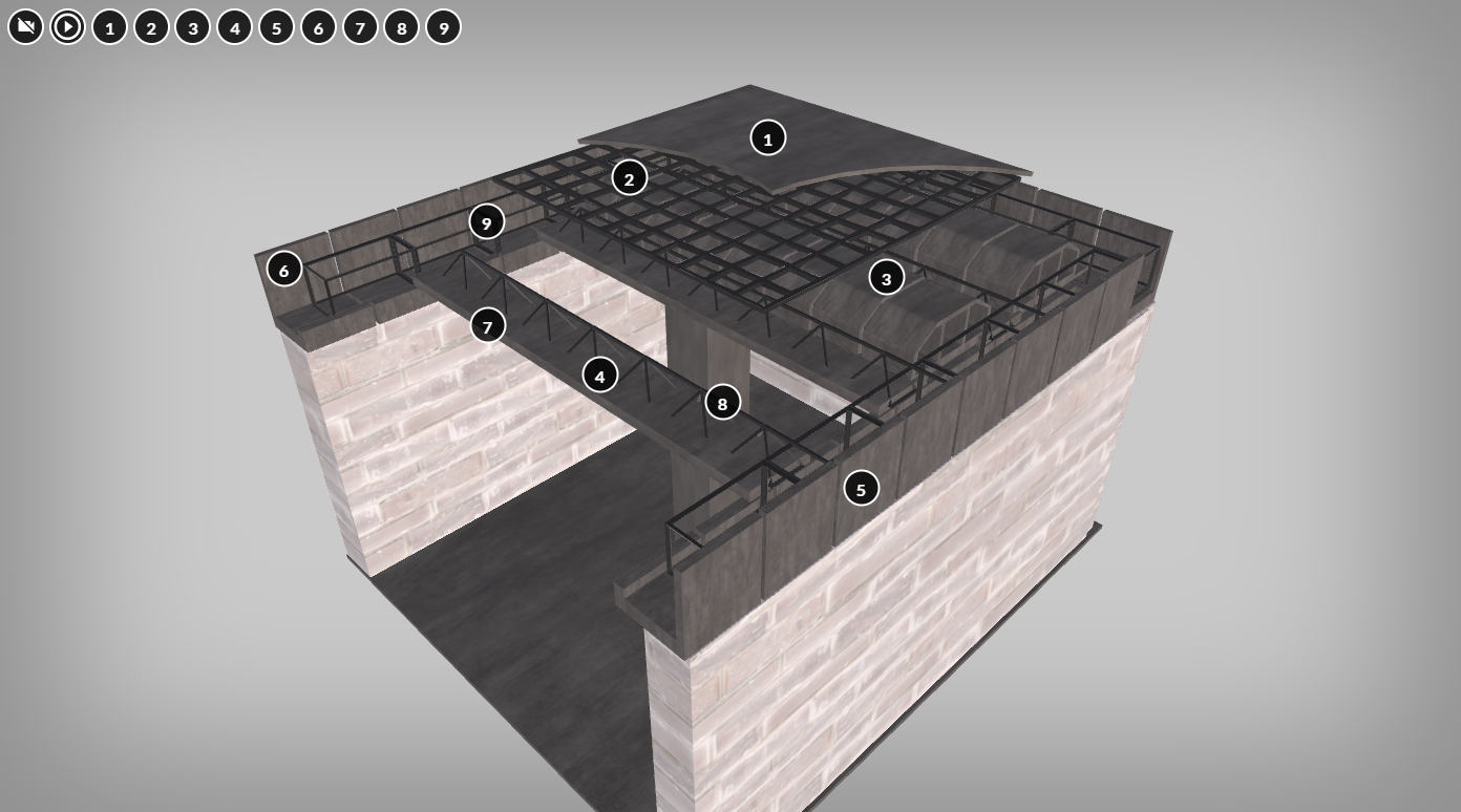 Wizualizacja trzy de przedstawia układ zbrojenia belki żelbetowej. Umożliwia obserwację obiektu z zewnątrz, z perspektywy obserwatora obchodzącego obiekt wokół, z góry i od dołu. W lewym górnym rogu oraz przy elementach wizualizacji umieszczono po dziewięć znaczników z cyframi. Po kliknięciu przycisku wyświetla się ramka z podpisem danego elementu. Zaprezentowano na niej zbrojenie belki osadzonej na konstrukcji ściany nośnej. Konstrukcje belek ułożone są poziomo, równolegle do siebie. Zbrojenie to składa się z prętów głównych, umieszczonych wzdłuż i połączonych za pomocą prętów pomocniczych tworzących kwadratowe ramki. Treść nagrań jest tożsama z opisami. 1. Nadbeton 2. Siatka zbrojenia przypodporowa 3. Zbrojenie żebra rozdzielczego 4. Podpora montażowa 5. Zbrojenie wieńca 6. Kształtka zewnętrzna KZE 7. Belka rozporowa 8. Pręty pomocnicze – strzemiona 9. Pręty główne