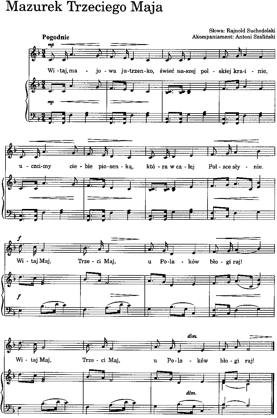 1. Tekst pieśni patriotycznej „Witaj, majowa jutrzenko”, zwanej też Mazurkiem Trzeciego Maja powstał w kwietniu 1831 r., z okazji 40 rocznicy uchwalenia Konstytucji 3 Maja. Napisał go uczestnik powstania listopadowego i działacz niepodległościowy Rajnold Suchodolski. Melodia, do której wykonywano utwór, była już powszechnie znana, niekiedy przypisywano ją Fryderykowi Chopinowi. Richard Wagner użył jej jako motywu uwertury Polonia.