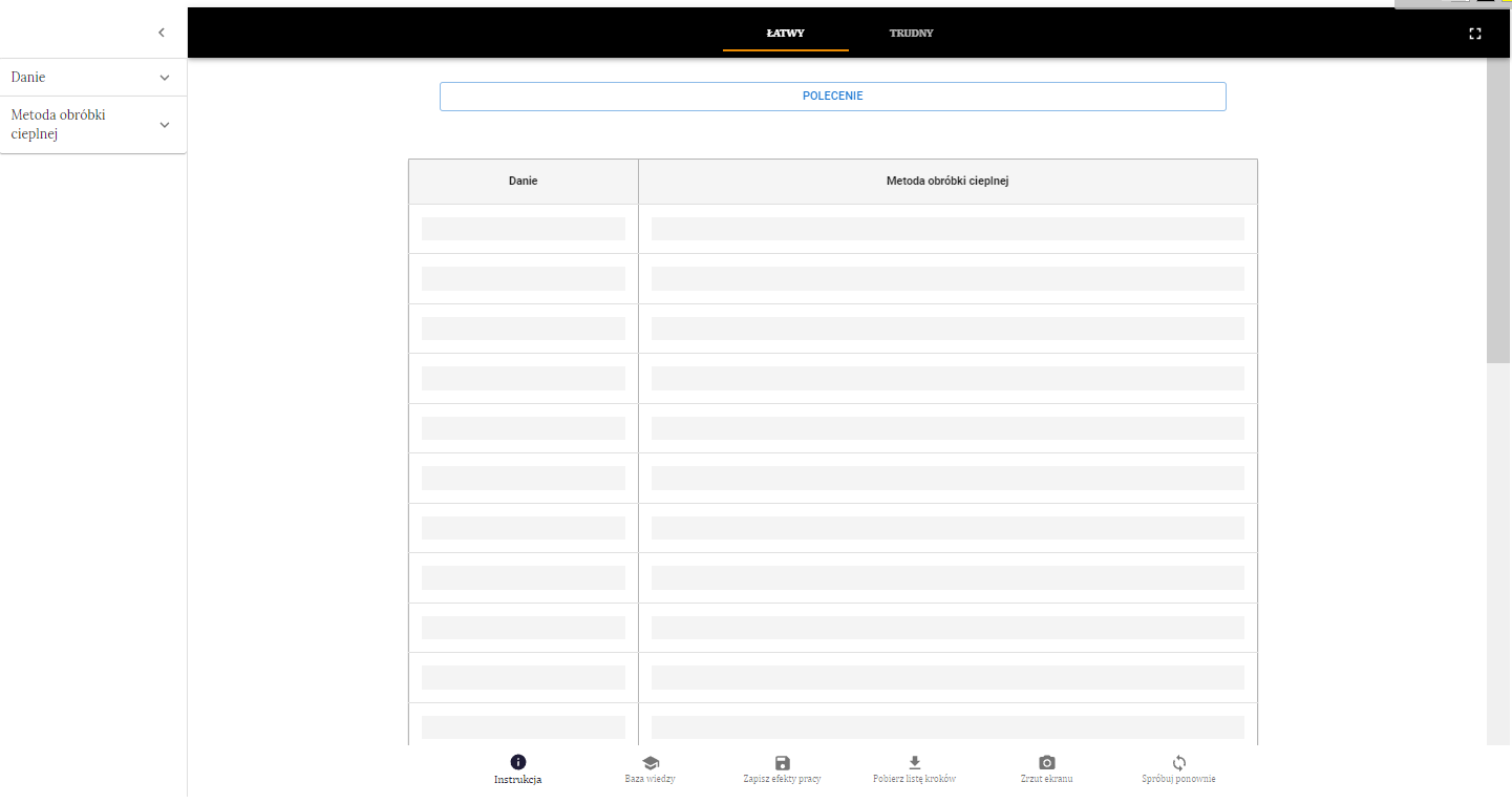 Poniżej górnej belki znajduje się przycisk „Polecenie”, po kliknięciu na który pojawia się opis kolejnych kroków do wykonania. W dolnym pasku ekranu znajdują się ikony: „Instrukcja” programu ćwiczeniowego - zawierająca wszystkie instrukcje techniczne niezbędne do korzystania z programu ćwiczeniowego; ikona „Baza wiedzy”, ikona „Zapisz efekty pracy”, ikona „Pobierz listę kroków”, która w dowolnym momencie umożliwia zapisanie postępów pracy i pobranie pliku na komputer, ikona „Zrzut ekranu” oraz ikona „Spróbuj ponownie”, która umożliwia wykonanie ponownie ćwiczenia.