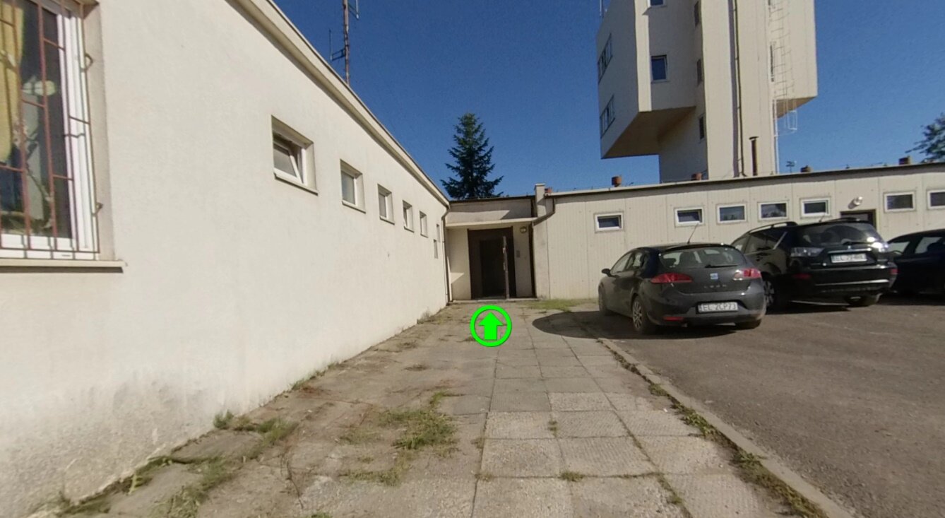 Wirtualną wycieczkę rozpoczynamy od placu parkingowego znajdującego się przed nastawnią. Znajduje się na nim koparka oraz kilka samochodów osobowych. Budynek nastawni jest parterowy i posiada wieżę. Przez drzwi wchodzimy do wiatrołapu, w którym po lewej stronie od wejścia znajdują się drzwi z oznakowaniem: nieupoważnionym wstęp wzbroniony. Pod prawej stronie znajdują się dwie czerwone skrzynki stanowiące wyposażenie i oraz przejście do korytarza. Na ścianie naprzeciwko drzwi znajdują się dwie strzałki wskazujące na korytarz jedna z napisem: nastawnia , a druga z napisem łazienka, obok znajduje się również instrukcja noszenia maseczki. Przenosimy się do korytarza, tutaj na ścianie znajduje się strzałka w lewo z podpisem: Nastawnia oraz drzwi na wprost. Najpierw udamy się w lewą stronę. Teraz znajdujemy się na klatce schodowej. Schody są metalowe, udamy się nimi na górę. Znajdujemy się w wieży, w której znajduje się sprzęt do zarządzania ruchem nastawni, czyli tak zwany pulpit nastawczy. Nad oknami wiszą monitory. Po przeciwnej stronie sprzętu do zarządzania ruchem stoi biurko, na którym leżą dokumenty oraz różne sprzęty biurowe takie jak drukarka czy faks. W pomieszczeniu widoczne są dwa punkty interaktywne z tekstem. Treść planszy pierwszej. Pulpit nastawczy to urządzenie lub system, który umożliwia personelowi kolejowemu kontrolowanie ruchu pociągów oraz zarządzanie elementami infrastruktury kolejowej, takimi jak zwrotnice, sygnalizacja, semafory itp. Pulpit nastawczy jest używany w nastawniach kolejowych, gdzie pracownicy, zwani nastawnikami, podejmują decyzje dotyczące ruchu pociągów na danym odcinku torów. Umożliwia nastawnikowi monitorowanie ruchu pociągów, podejmowanie decyzji dotyczących trasy, zmiany sygnalizacji świetlnej oraz koordynowanie działań na obszarze, którym zarządza. To narzędzie odgrywa kluczową rolę w zapewnieniu bezpieczeństwa ruchu kolejowego i efektywnego zarządzania infrastrukturą kolejową. Treść planszy drugiej. Stanowisko dyżurnego ruchu jest kluczowym punktem w systemie kolejowym, gdzie odpowiedzialny pracownik, zwany dyżurnym ruchu, sprawuje kontrolę nad ruchem pociągów i zarządza infrastrukturą kolejową. Na drugim piętrze wieży znajduje się pomieszczenie z biurkiem oraz pulpitem zintegrowanym e a be trzy. W pomieszczeniu widoczny jest punkt interaktywny z tekstem. Treść planszy. Pulpit zintegrowany e a be trzy służy do obsługi systemu automatycznego sterowania rozrządzaniem a es er, który obejmuje funkcje, takie jak samoczynne nastawianie zwrotnic w strefie podziałowej, automatyczne lub półautomatyczne sterowanie hamulcami torowymi oraz automatyczne sterowanie lokomotywą napychającą. Urządzenia działają na podstawie wprowadzonej karty rozrządowej oraz czujników określających parametry odprzęgów. Górki rozrządowe pe ka pe, modernizowane w drugiej połowie lat osiemdziesiątych, typowo wyposażane były w pulpity zintegrowane typu e a be trzy. Wracamy na klatkę schodową, a następnie do korytarza. Tym razem pójdziemy prosto przez drzwi. Teraz jesteśmy w przekaźnikowni. Po obu stronach pomieszczenia znajdują się stojaki na przekaźniki. Na stojakach znajdują się przekaźniki, czyli najważniejsze elementy automatyki kolejowej. Przekaźniki działają jak przełączniki, co sprawia, że możemy uzyskiwać wszelakie możliwe kombinacje zależności, pełnią one rolę połączenia gruntu z pulpitem nastawczym. Z każdego stojaka wychodzą dwie wiązki kabli, jedna do góry, która prowadzi do pulpitu nastawczego, a druga do gruntu, która łączy przekaźniki z semaforami, rozjazdami i odcinkami izolowanymi. W pomieszczeniu znajduje się punkt interaktywny z tekstem. Treść planszy. Przekaźnikownia to miejsce, w którym zainstalowane są przekaźniki elektromagnetyczne. Jest swoistym pośrednikiem między poleceniami wydawanymi przez dyżurnego ruchu a urządzeniami przytorowymi. Przekaźnik jest urządzeniem służącym do sterowania zestykami elektrycznymi pod wpływem przepływu prądu przez obwód sterujący przekaźnikiem. Przekaźniki umożliwiają powiązanie obwodów o różnych poziomach napięć, zwielokrotnianie sygnałów oraz tworzenie różnych zależności pomiędzy obwodami. Pod względem pewności działania przekaźniki dzielą się na przekaźniki I klasy, przekaźniki II klasy - których działanie powinno być dodatkowo kontrolowane - oraz przekaźniki pomocnicze, które nie mogą być stosowane w obwodach bezpośrednio związanych z bezpieczeństwem ruchu kolejowego. Skręćmy w prawo. Znajdujemy się pomiędzy dwoma stojakami na przekaźniki, skąd przechodzimy do kolejnego pomieszczenia przekaźnikowni. Tutaj również po obu stronach pomieszczenia stojaki z przekaźnikami są ułożone w rzędach. Na środku pomieszczenia znajdują się dwa biurka, na których leżą elementy zamienne do przekaźników. Pod ścianą tego pomieszczenia również znajduje się wiele poukładanych podzespołów niezbędnych w przekaźnikowni. Na koniec wróćmy do poprzedniego pomieszczenia, i udajmy się na jego sam koniec, gdzie znajduje się niewielki stolik, na którym leżą dokumenty.