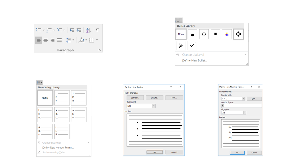 When you start a paragraphparagraph paragraph with an asterisk (*) or > and a spacespacespace , it will result in creating a bulleted listbulleted listbulleted list . However when you start a paragraphparagraph paragraph with an Arabic or Roman numeral and a period (e.g. 1. or I.), a numbered listnumbered listnumbered list will be created.