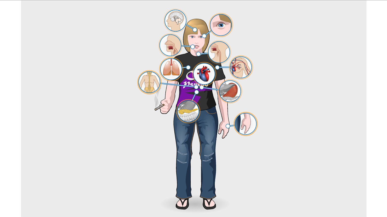 Palenie papierosów (w tym e‑papierosów) może prowadzić do raka płuc, krtani, gardła, zatok nosowych, mózgu, pęcherza moczowego, piersi. Może spowodować choroby serca, zapalenie oskrzeli i astmę.