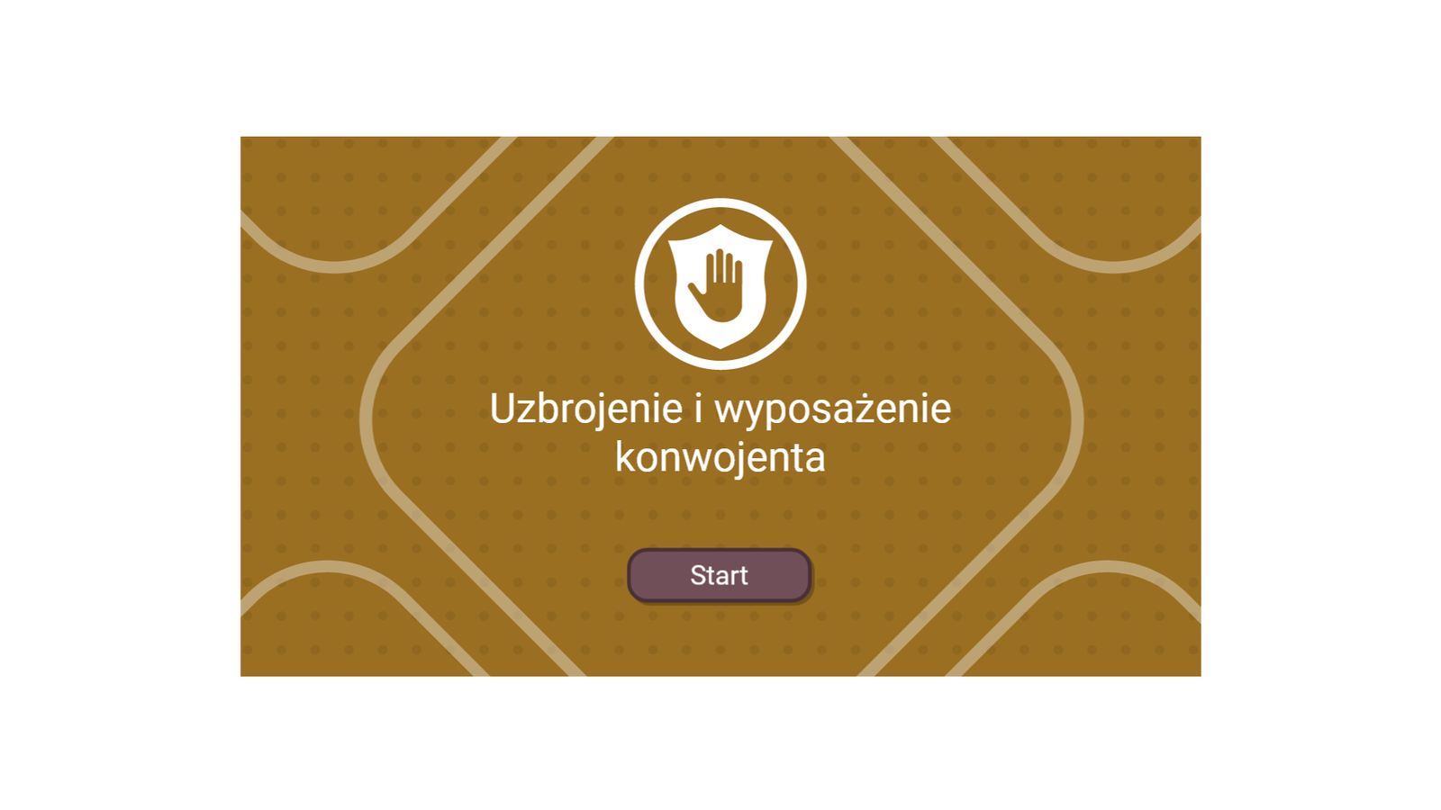 Program ćwiczeniowy do projektowania przez dobieranie “Uzbrojenie i wyposażenie konwojenta” rozpoczyna się ekranem startowym. Program umożliwia zaprojektowanie obligatoryjnego i fakultatywnego uzbrojenia i wyposażenia konwojenta poprzez dobór broni palnej i normatywu amunicji, środków przymusu bezpośredniego, środków ochrony osobistej, środków łączności, pojemników specjalistycznych oraz bankowozów, spośród gotowych zdjęć. Klikając przycisk Start, użytkownik przechodzi do ekranu menu z wyborem jednego z trzech zadań lub kreatora otwartego. Zadania ponumerowane od 1 do 3 są o różnych stopniach trudności, od najłatwiejszego do najtrudniejszego.