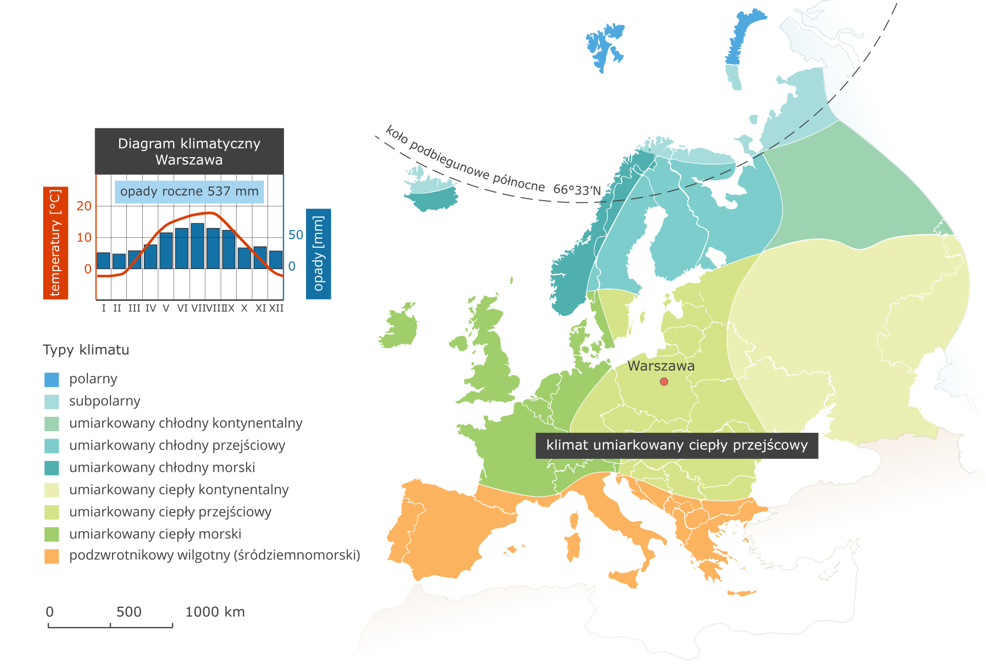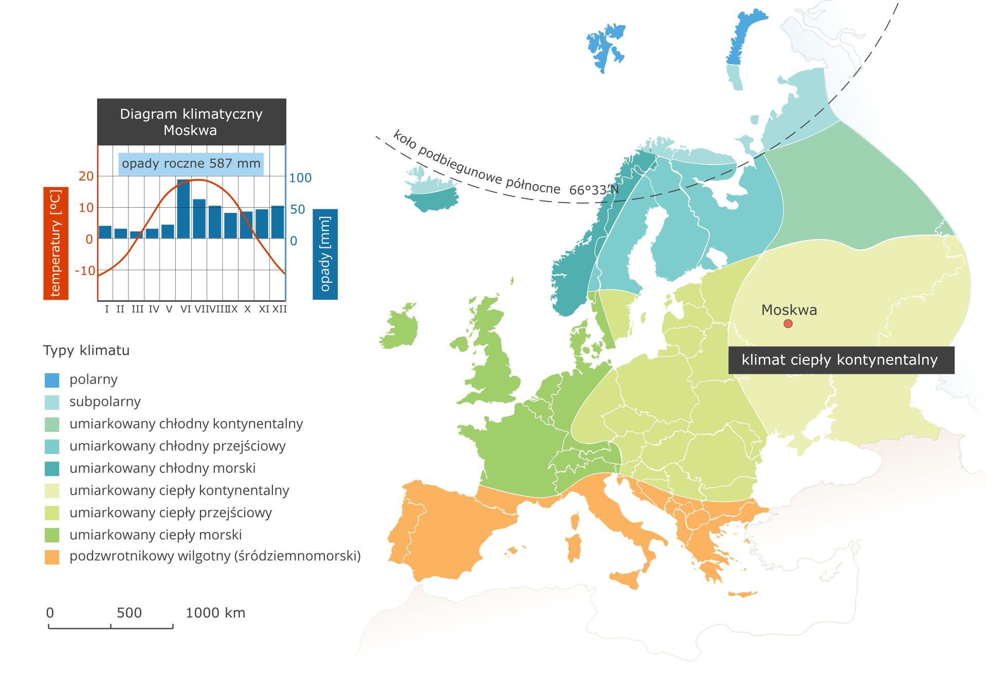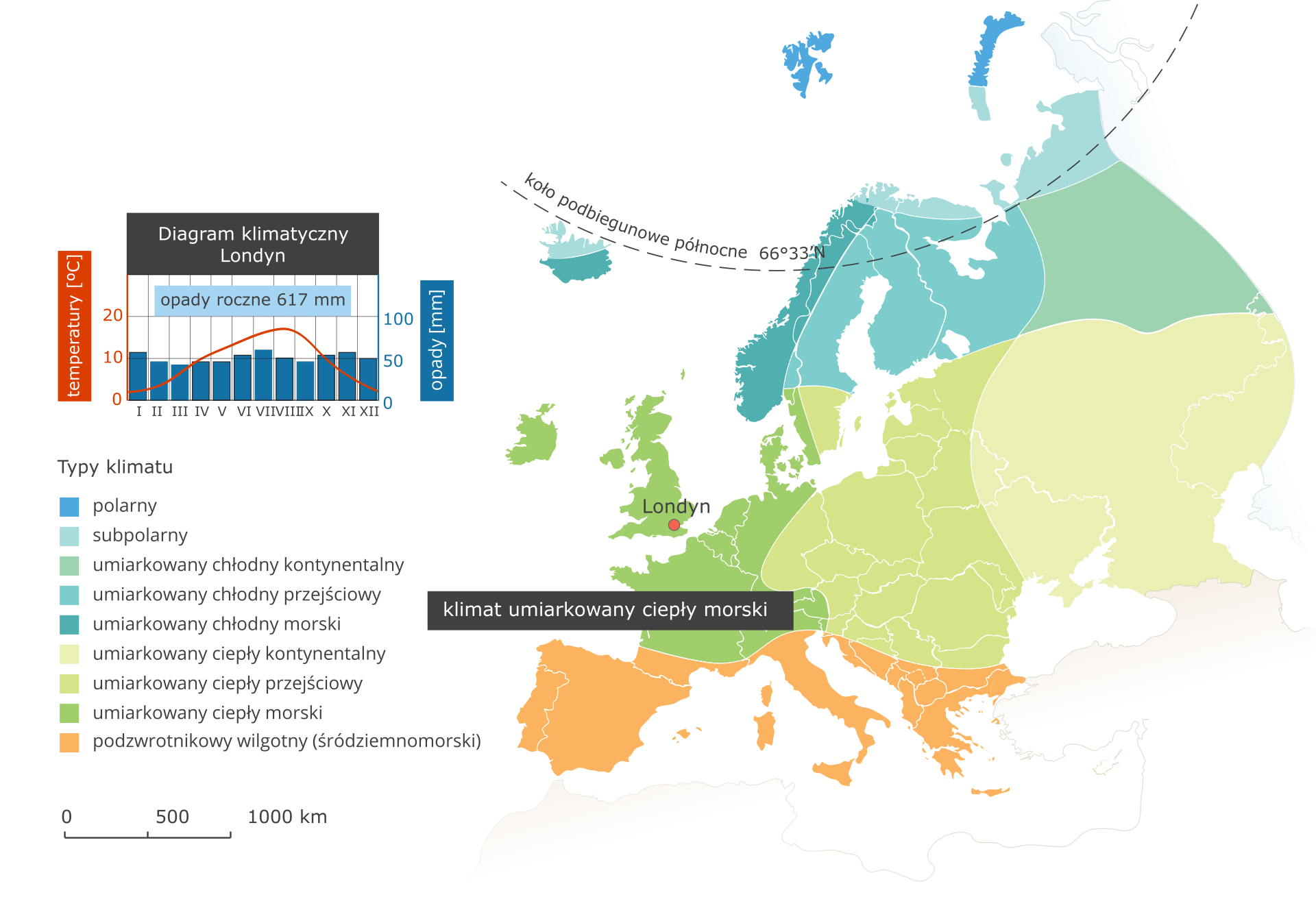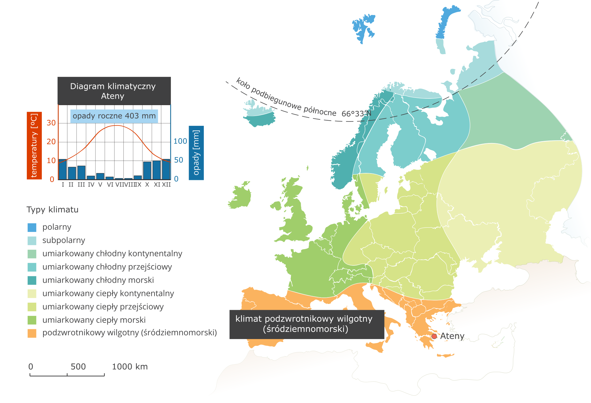 In the map above, ranges of climate types, present in Europe, have been visualised. Next to the map, climatic charts of typical stations will be shown. Using the map, proceed according to the following instructions.