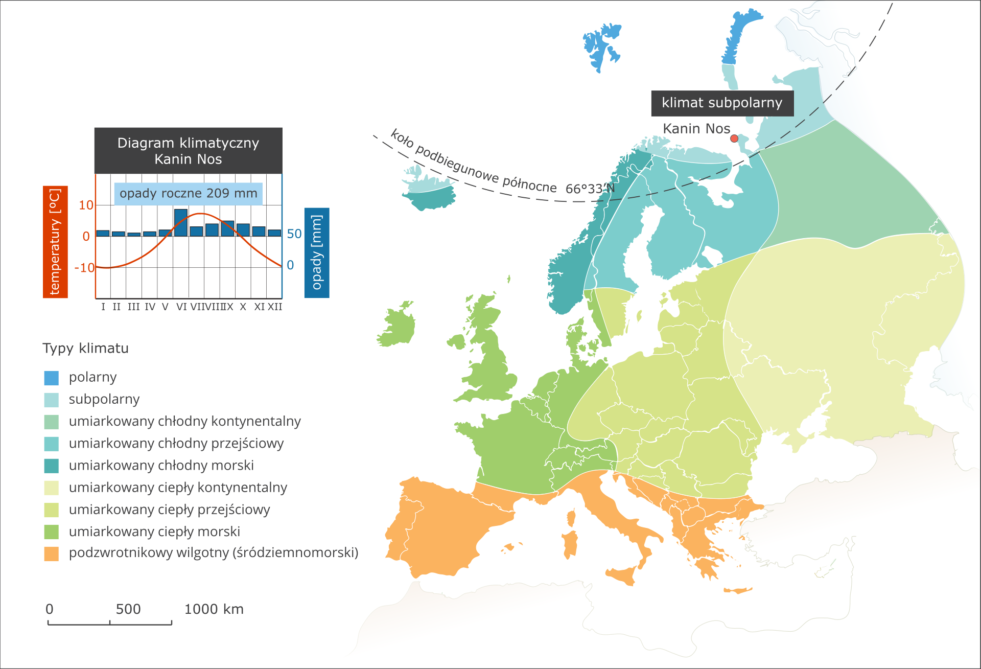 , Subpolar climate - Kanin Nos climate station opis WCAG Cold climates prevail in northern outskirts of Europe. In the islands, lying far up the north, it may even a polar climate. Winter, i.e. the period when average air temperature drops below 0°C, spans over 7-8 months. In the warmest month, air temperature does not exceed 10°C. Precipitation is low, reaching 200 mm per year. A significant feature of this climate is high variability of weather types., Mountain climate In the mountainous regions of Europe, a type of climate with distinctive altitudinal zones prevails. Air temperature is always significantly lower than in the area surrounding a mountain chain, and precipitation amount is always higher. Depending on geographical location of a mountain massif, altitudinal zones may have their borders lying at different altitudes.