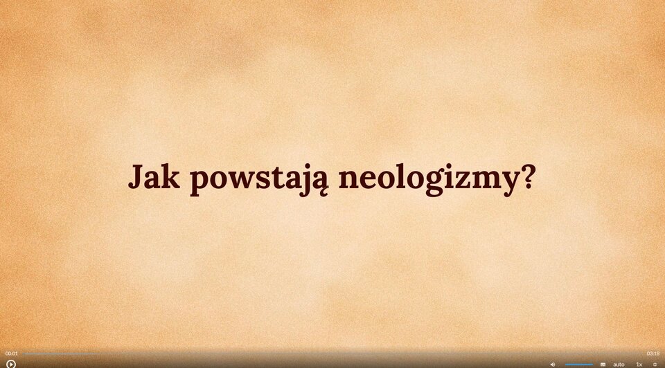 Animacja opowiada o powstawaniu neologizmów. Na animacji widzimy słowa pojawiające się na planszy, a także postaci ludzkie (chłopiec, dziecko) i przedmioty (mikrofon, radio, budynek banku, pomnik).