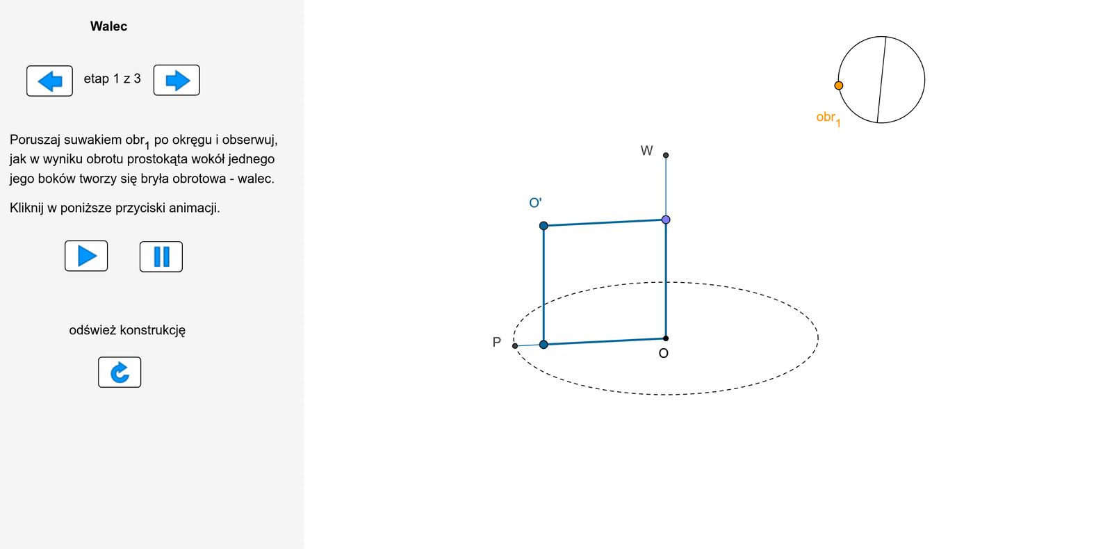 Aplet przedstawia konstrukcję walca na płaszczyźnie. Na płaszczyźnie dany jest punkt O, odcinek OW prostopadły do płaszczyzny i okrąg o środku w punkcie O. Na okręgu leży punkt P. Na płaszczyźnie narysowany jest prostokąt, którego jeden bok zawiera się w promieniu okręgu, a drugi leży na osi obrotu. Obracając prostokąt wokół jednego z boków, otrzymujemy walec.